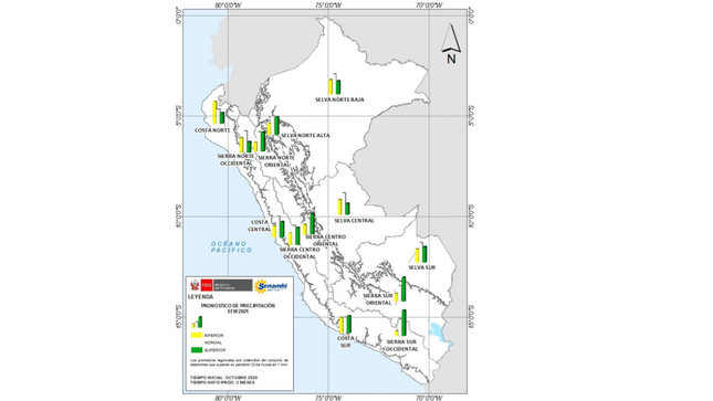 El Servicio Nacional de Meteorología e Hidrología del Perú (Senamhi) informa que, según la más reciente actualización de los escenarios de lluvias para el verano 2021 (promedio enero-marzo) se prevén lluvias por encima de lo normal en la zona andina sur del país, y valores entre inferiores a normales en la costa norte y sierra norte occidental.